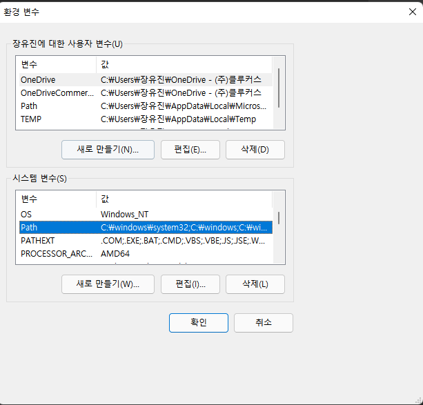 설정 -> 시스템 -> 정보 -> 고급 시스템 설정 -> 고급 -> 환경변수 -> 시스템 변수에 있는 Path 편집