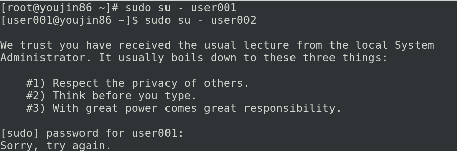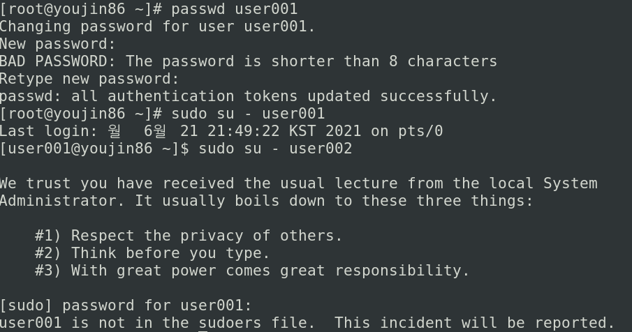 안했을 경우, 그 계정 이용 시 패스워드를 입력하지 못해 sudo 명령어를 사용할 수 없음.