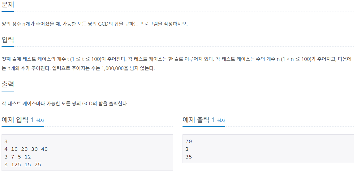 4 10 20 30 40 -> n=4, 10,20,30,40 4개로 GCD 구하는 것